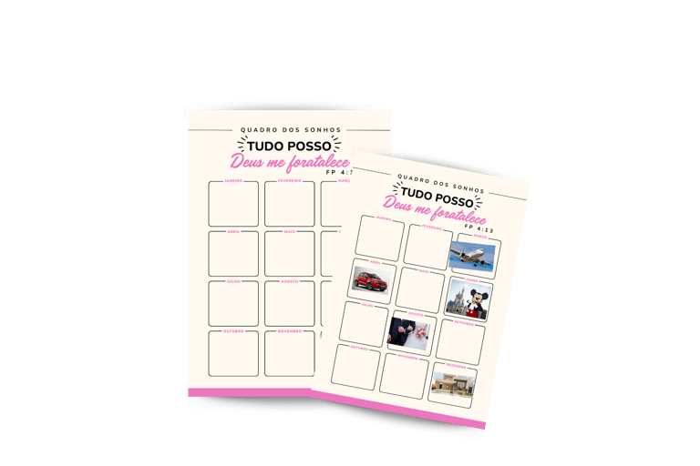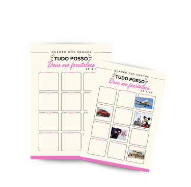 Quadro visual para imprimir e registrar sonhos, metas e orações.